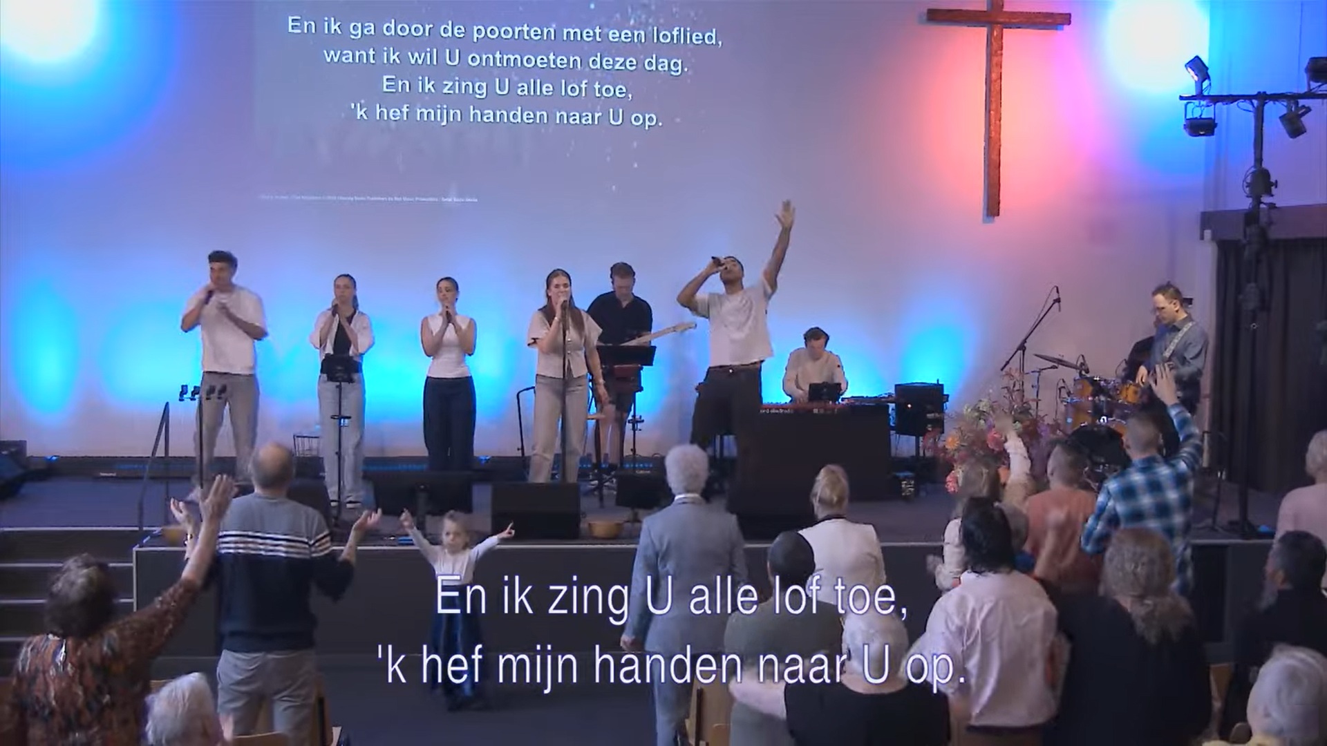 Het mooie van bovenstaande afbeelding is dat ook het projectiescherm (deels) zichtbaar is. Daarbij is goed zichtbaar hoe OPS coupletten verdeeld.