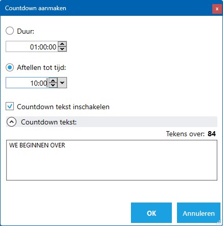 Bij 'Aftellen tot tijd, in uur en minuten, tot wanneer afgeteld wordt, bijvoorbeeld '10:00' voor tien uur 's morgens.